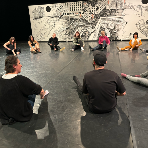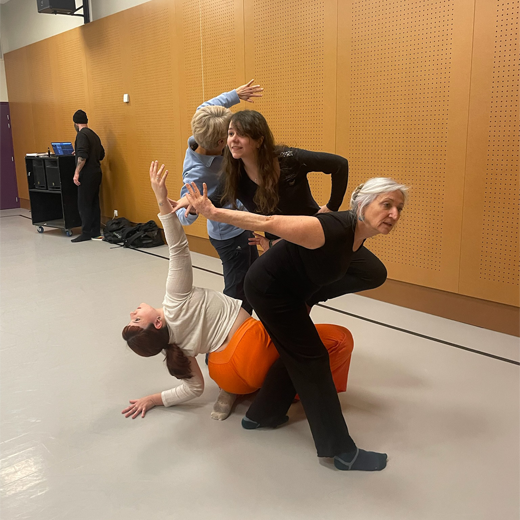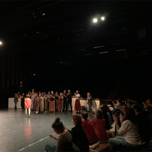 Petit à petit, iels ont su faire corps ensemble, suivant un travail d’exploration corporelle en groupe, mais aussi vocal. Les 4 week-ends d’ateliers de transmission entre décembre et février ainsi que la soirée de répétition avec les artistes leur ont également permis de faire connaissance et de créer une belle cohésion. Celle-ci fut d’autant plus renforcée par le fait de se retrouver sur scène dans une scénographie mouvante et proche des spectateur·rice·s installé·e·s tout autour qu’iels invitaient à la fin à les rejoindre dans leur transe.