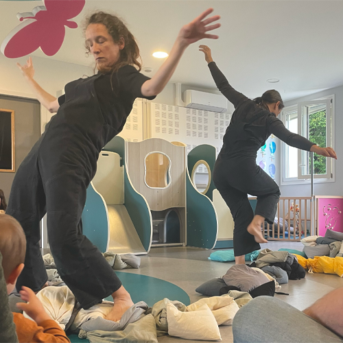 Ce spectacle intimiste adressé aux adultes et aux enfants a été l’occasion pour les plus petit·e·s et leurs parents de vivre une expérience immersive sensorielle et corporelle de l’espace, en musique et en dessin. Caroline et Magalie les ont reçu·e·s dans une bulle de douceur.